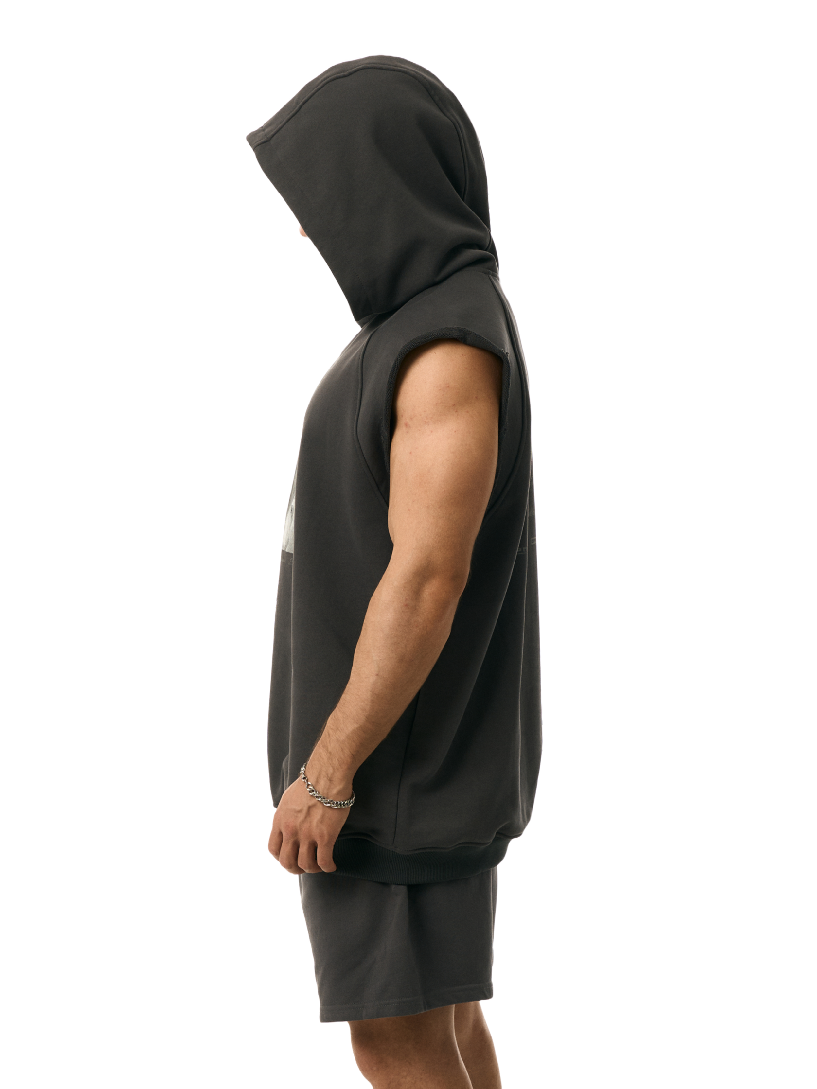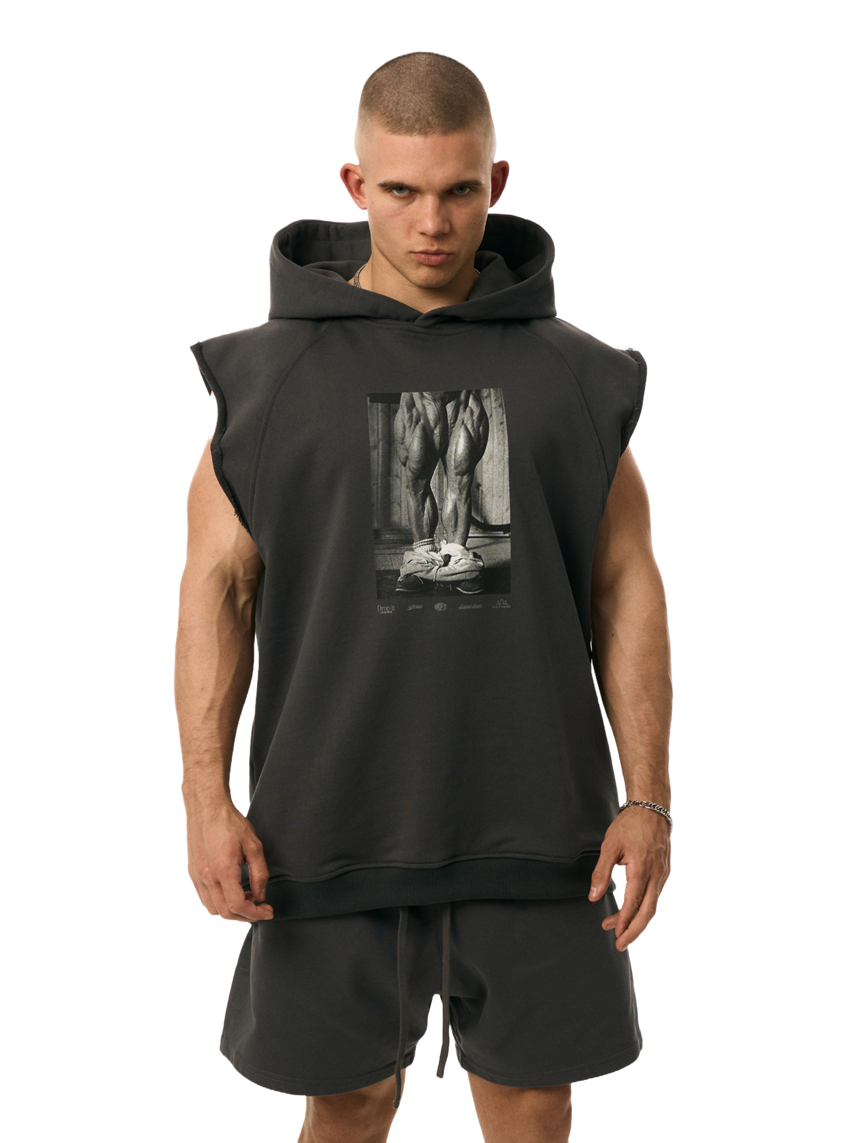 Безрукавка из хлопкового трикотажа, цвет серый графит. Принт спереди на груди, логотип сзади.